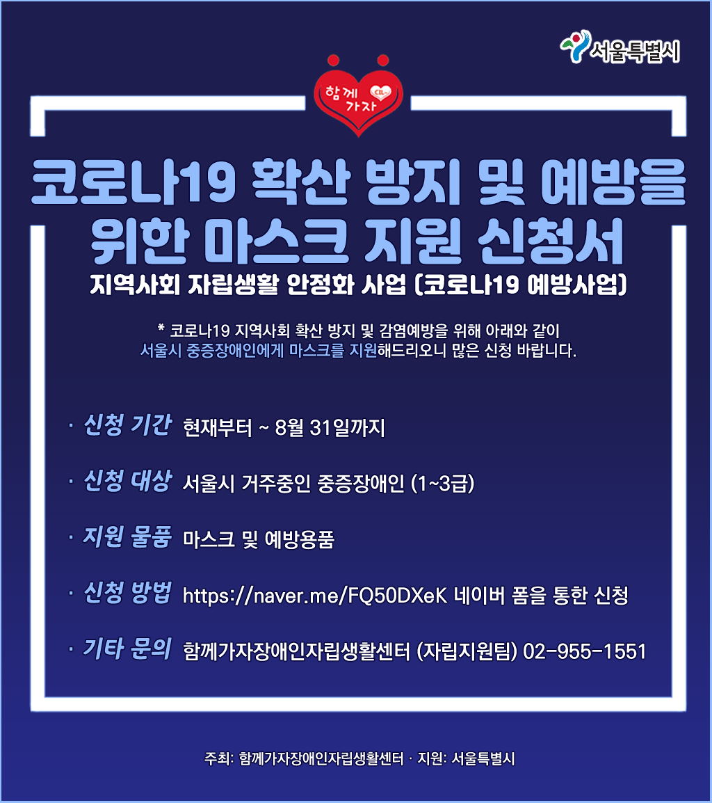 코로나19 지역사회 확산 방지 및 감염예방을 위해 아래와 같이 서울시 중증장애인에게 마스크를 지원해드리오니 많은 신청 바랍니다.