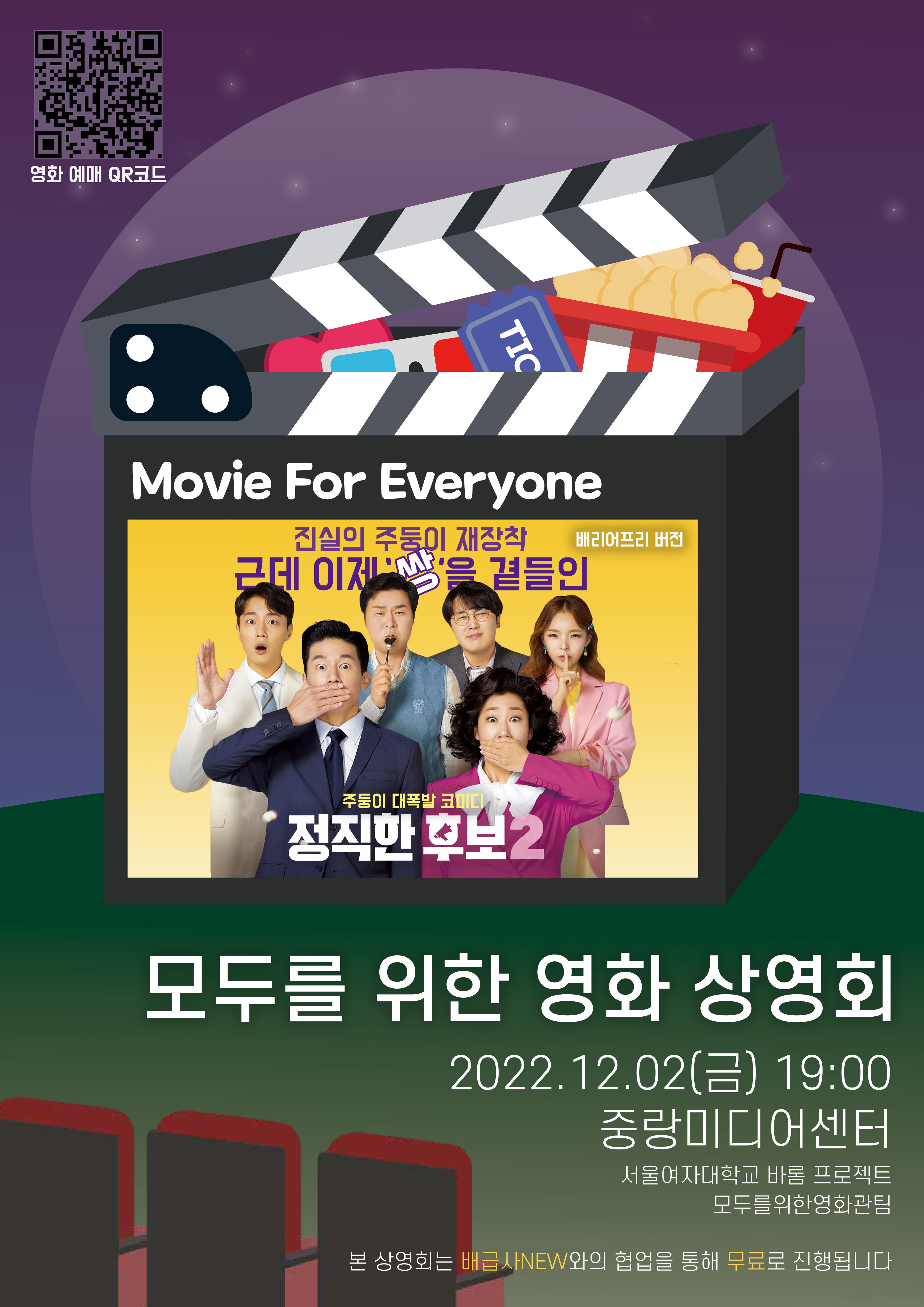 본 상영회는 서울여자대학교 바롬종합설계프로젝트 '모두를 위한 영화관'팀이 주최하며 '배급사NEW'와의 협업을 통해 '무료'로 진행됩니다.