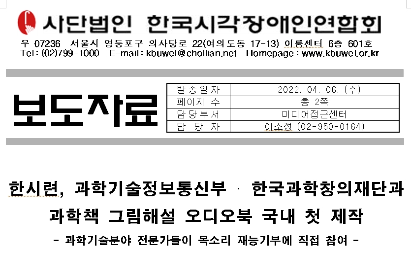 [보도자료]한시련, 과학기술정보통신부·한국과학창의재단과 과학책 그림해설 오디오북 국내 첫 제작1
