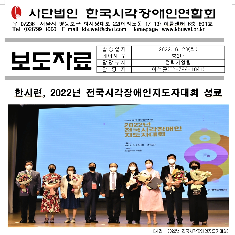 사단법인 한국시각장애인연합회(회장 김영일, 이하 ‘한시련’)는 지난 23일부터 24일까지 충남 예산의 스플라스 리솜 리조트에서 진행한 ‘2022년 전국시각장애인지도자대회’를 성황리에 마쳤다.