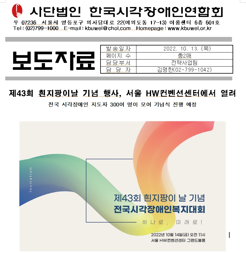 [보도자료]제43회 흰지팡이날 기념 행사, 서울 HW컨벤션센터에서 열려1