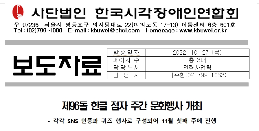 (사)한국시각장애인연합회(회장 김영일) 제96돌 한글 점자 주간(11월 첫째주)을 맞아 제96돌 한글 점자 주간 문화행사를 진행한다.