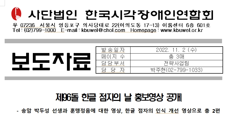 (사)한국시각장애인연합회(회장 김영일, 이하 한시련) 제96돌 한글 점자의 날 및 한글 점자 주간을 맞아 한글 점자에 대한 홍보영상 2편을 제작해 공개하였다.