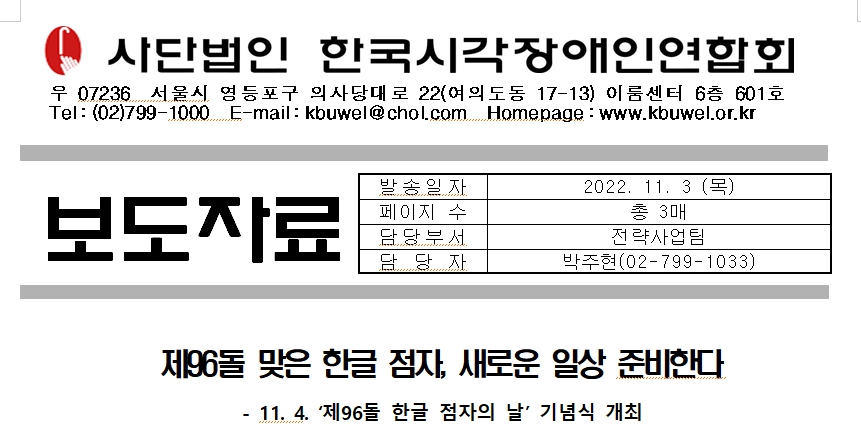 문화체육관광부(장관 박보균, 이하 문체부)는 한국시각장애인연합회(회장 김영일)와 함께 11월 4일(금) 오후 2시 ‘제96돌 한글 점자의 날’ 기념식을 에이치더블유(HW)컨벤션센터에서 개최한다. 다만 국가애도기간임을 고려해 행사를 축소하고 묵념을 통해 추모할 계획이다.