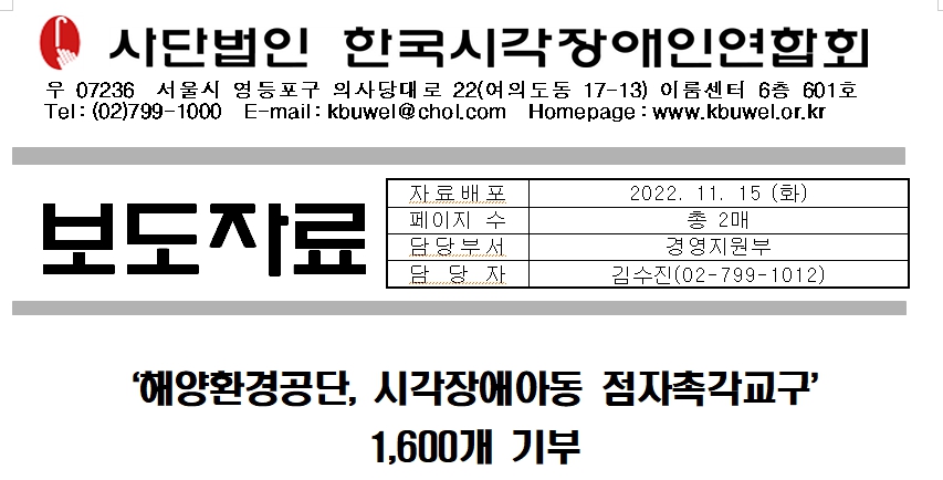 유상준 해양보전본부장은 “시각장애 아동이 지식을 익히고 꿈과 희망을 키워가는 소중한 기회가 되길 바란다”며, “해양폐기물 새활용을 통해 사회적 약자들에게 도움이 될 수 있는 사업 추진에 앞장서겠다“고 말했다.