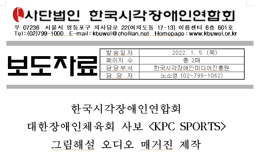 사단법인 한국시각장애인연합회(회장 김영일)는 대한장애인체육회(회장 정진완)와 협업하여 국내 처음으로 ‘그림해설 오디오 매거진’을 제작했다고 3일 밝혔다.