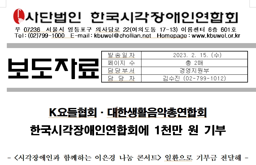 K요들협회는 대한생활음악총연합회와 함께 지난 14일 한국시각장애인연합회를 방문하여 1,000만원을 기부했다. 본 기부금은 저소득층 시각장애인 학생수술 및 재활자금으로 쓰여질 예정이다.