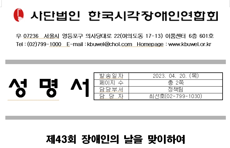 제43회 장애인의 날을 맞아 보건복지부가 발표한 구호는 ‘차별은 없이, 기회는 같이, 행복은 높이’다. 하지만 우리 50만 시각장애인들은 여전히 차별받고 있고, 기회는 공평하지 않으며, 행복과 멀리 있다.