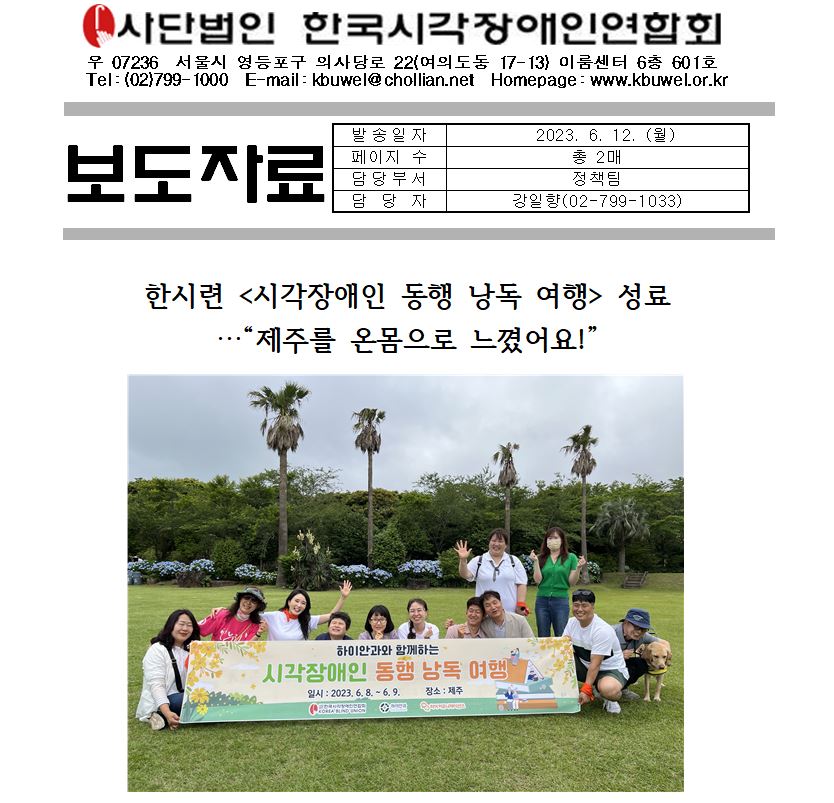한국시각장애인연합회(이하 한시련, 회장 김영일)는 지난 6월 8일(목)부터 이틀 동안 제주에서 <시각장애인 동행 낭독 여행>을 개최했다. 이번 여행에는 한시련 대표 사서함 방송 ‘큐! 뉴스천’을 애청하는 시각장애인 5명과 방송 내 코너‘큐! 말말말’을 진행하는 비장애인 스토리텔러 5명이 짝을 이뤄 동행했다.