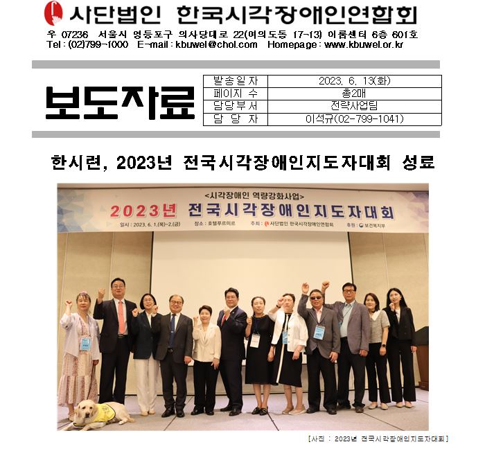 사단법인 한국시각장애인연합회(회장 김영일, 이하 ‘한시련’)는 지난 1일부터 2일까지 경기 화성의 호텔푸르미르에서 진행한 ‘2023년 전국시각장애인지도자대회’를 성황리에 마쳤다.