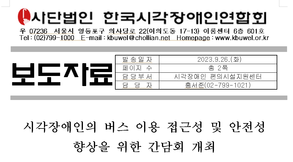 사단법인 한국시각장애인연합회(회장 김영일)는 오는 10월 6일 오후 2시에 서울 영등포구 소재 이룸센터에서 ‘시각장애인의 버스 이용 접근성 및 안전성 향상을 위한 간담회’를 개최한다.