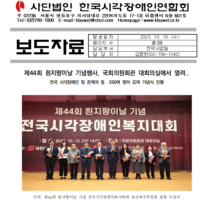 (사)한국시각장애인연합회(이하 '한시련')는 매년 10월 15일 ‘흰지팡이날’을 전후하여 전국 17개 지부에서 기념식 및 부대행사를 열어 이 날을 기념하고 있다. 이에 한시련 중앙회는 지난 10월 13일 금요일 오후 2시에 서울특별시 국회의원회관 대회의실에서 전국 시각장애인 350여 명이 모여 ‘제44회 흰지팡이날 기념 전국시각장애인복지대회’를 진행하였으며, 유튜브 한국시각장애인연합회 채널에서도 생중계되었다.
