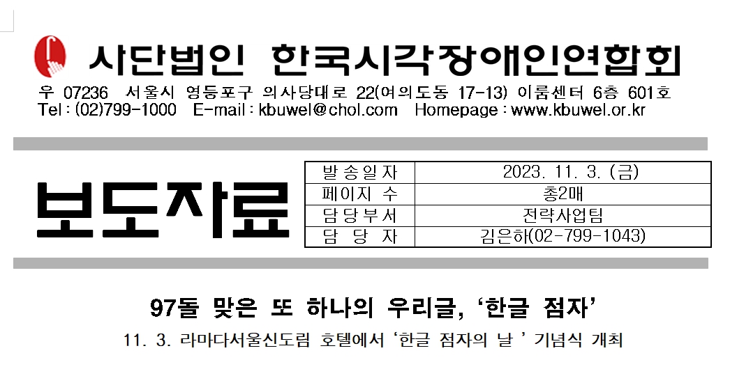 한국시각장애인연합회(회장 김영일)는 문화체육관광부(장관 유인촌, 이하 문체부)와 함께 11월 3일(금) 오후 2시에 라마다서울신도림 호텔에서 ‘제97돌 한글 점자의 날’ 기념식을 개최한다.