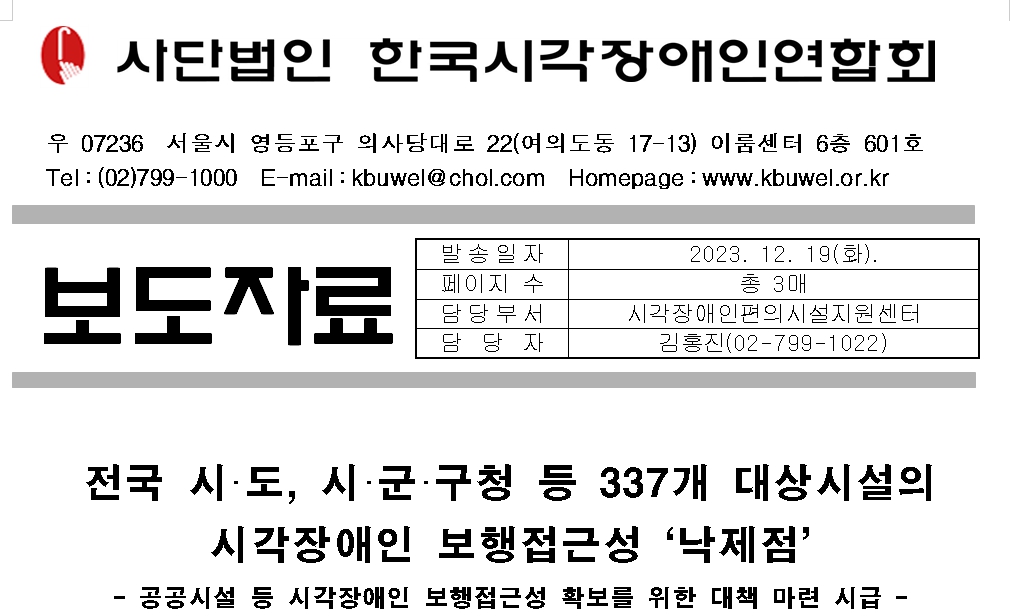 (사)한국시각장애인연합회 중앙회(회장 김영일) 시각장애인편의시설지원센터는 2023년 5월 1일부터 9월 30일까지 약 5개월간 시각장애인의 보행환경 접근성 파악하기 위해 「교통약자의 이동편의 증진법」(이하 교통약자법), 「장애인ㆍ노인ㆍ임산부 등의 편의증진 보장에 관한 법률」(이하 장애인등편의법)을 근거로 전국 시·도, 시·군·구청 277개, 시각장애인연합회 전국 지부 및 회원단체 60개 총 337개 대상시설의 보행접근 관련 시각장애인 편의시설 실태조사를 실시하였다.