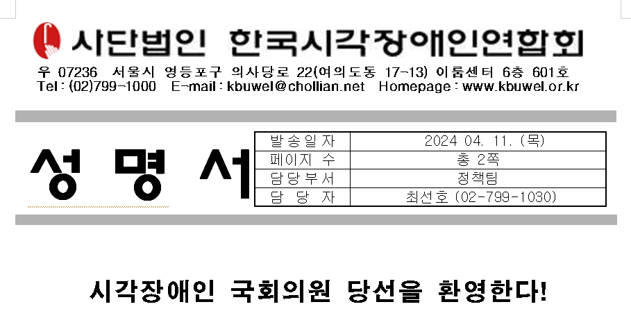 한국시각장애인연합회(회장 김영일)는 시각장애인 국회의원들이 시각장애 관련 입법 활동을 하는 데 있어 시각장애인 대표단체와의 상시적인 소통과 적극적인 협력을 당부한다. 또한 시각장애인 국회의원들이 시각장애인뿐만 아니라 소수 장애인, 발달장애인 등 모든 장애인을 위한 입법 활동을 통해 포용적 사회 환경을 만들어가는 데 헌신해 줄 것을 기대한다. 정희용, 김예지 그리고 서미화 3명의 제22대 국회의원 당선을 다시 한번 축하한다.