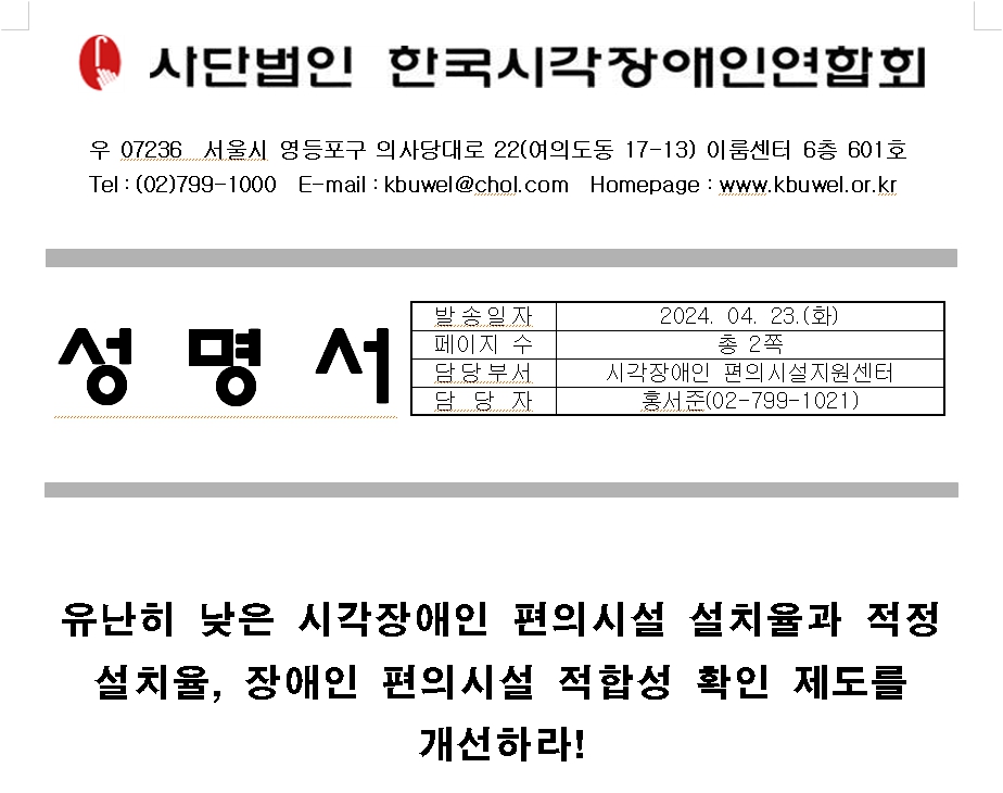 (사)한국시각장애인연합회(이하 ‘한시련’, 회장 김영일)는 5년 전에도 시각장애인 편의시설의 설치율과 적정 설치율을 높이기 위한 대책 마련을 촉구한 바 있다. 5년이 지난 2023년에 실시한 전수조사 결과에서도 시각장애인 편의시설의 설치율과 적정 설치율이 터무니없이 낮은 것으로 드러난 것은 현행 장애인 편의시설 적합성 확인 제도에 문제가 있기 때문이다.