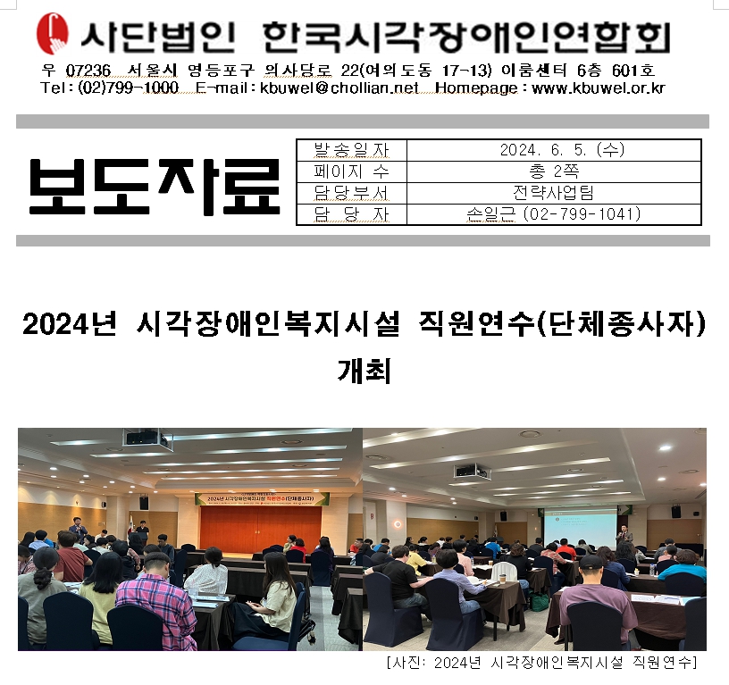 사단법인 한국시각장애인연합회(이하 ‘한시련’)는 5월 30일부터 31일까지 강원도 쏠비치 양양에서 시각장애인복지시설 종사자들을 대상으로 직원연수를 개최하였다.