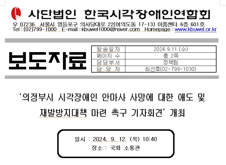 더불어민주당 국회의원 서미화, 국민의 힘 국회의원 최보윤, 한국시각장애인연합회와 대한안마사협회는 오는 9월 12일 오전 10시 40분, 국회 소통관에서 시각장애인 고 장성일 님의 사망을 애도하며, 장애인의 자립생활권리와 노동권 보장 등 대책 마련을 촉구하는 기자회견을 개최한다.