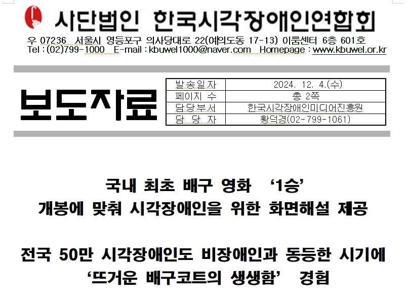 사단법인 한국시각장애인연합회(이하 ‘한시련’)는 12월 4일(수) 전국에서 개봉되는 송강호 주연의 영화 ‘1승’을 개봉 시기에 맞춰 다양한 목소리의 내레이션으로 화면해설을 제공할 계획이다.