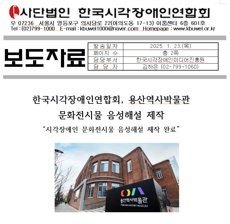 (사) 한국시각장애인연합회(회장 김영일)는 용산역사박물관과 협력하여 시각장애인을 위한 문화전시물 음성해설을 제작했다고 22일 밝혔다.