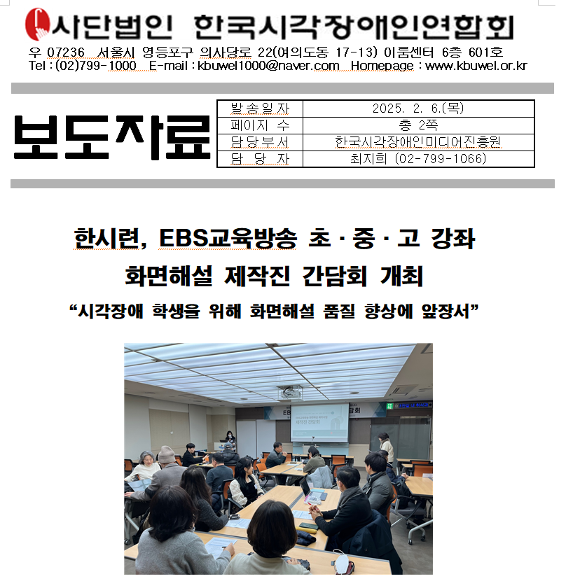 사단법인 한국시각장애인연합회(이하 ‘한시련’)는 1월 23일(목) 오후 2시, 서울 여의도 이룸센터에서 EBS교육방송 초·중·고 강좌 화면해설 제작진 간담회를 개최했다.
