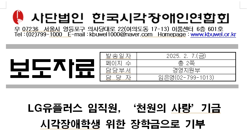 LG유플러스가 임직원 기금 ‘천원의 사랑’을 통해 (사)한국시각장애인연합회(이하 “한시련”)와 함께 복지 사각지대에 놓인 시각장애인의 어려움 해소에 나선다고 6일 밝혔다.