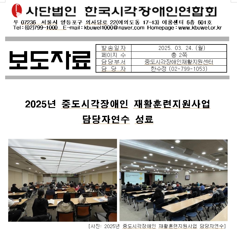 사단법인 한국시각장애인연합회 중도시각장애인재활지원센터는 3월 20일(목)부터 3월 21일(금)까지 1박 2일 일정으로 ‘2025년 중도시각장애인 재활훈련지원사업 담당자연수’를 실시했다. 이번 연수는 연계지회 사업 담당자 40명이 참여한 가운데 여의도 이룸센터에서 진행됐다.