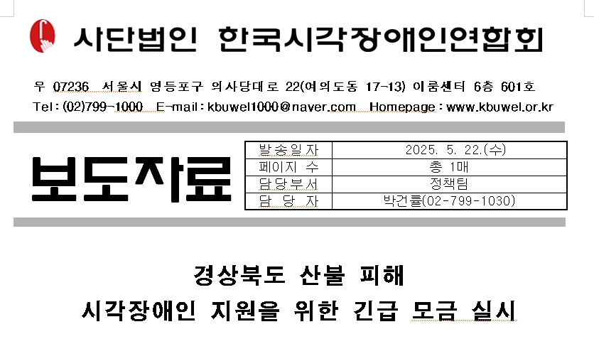 사단법인 한국시각장애인연합회(이하 "한시련")는 경상북도 산불 피해 시각장애인을 돕기 위한 긴급 모금을 진행 중이라고 22일 밝혔다.