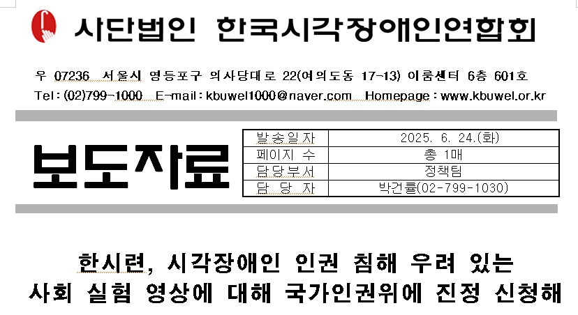 사단법인 한국시각장애인연합회(회장 김영일, 이하 한시련)는 시각장애인의 권익 옹호와 복지 증진을 위한 정책 제안 및 지원 사업을 수행하고 있는 시각장애인 당사자 중심의 대표 단체로 최근 시각장애인에 대한 인권 침해 요소가 있는 영상에 대해 국가인권위원회에 시각장애인을 대표해 진정을 신청했다고 24일 밝혔다.