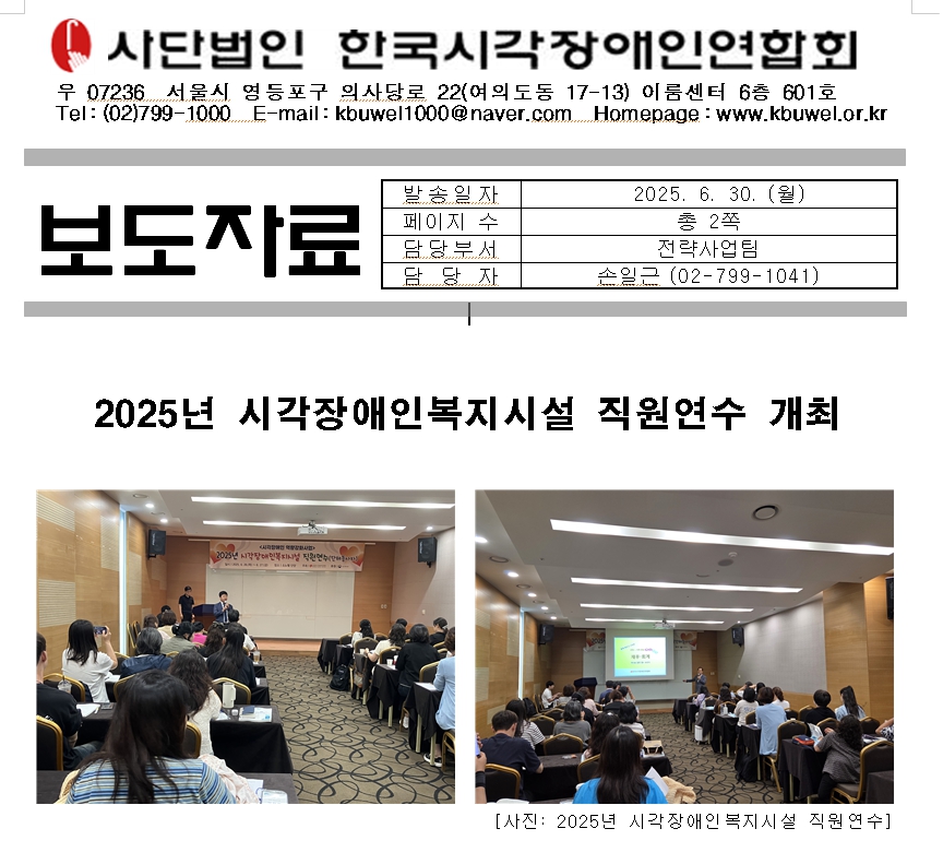 사단법인 한국시각장애인연합회(이하 ‘한시련’)는 6월 26일부터 27일까지 충북 단양 소노벨 단양에서 전국 시각장애인복지시설 종사자 약 40명을 대상으로 직원 연수를 개최했다. 이번 연수는 인사·총무 담당자의 실무 역량 강화에 중점을 두고, 현장에서 요구되는 전문지식 습득과 최신 제도·현안 공유, 종사자 간 교류 및 협력 활성화를 목적으로 마련됐다.