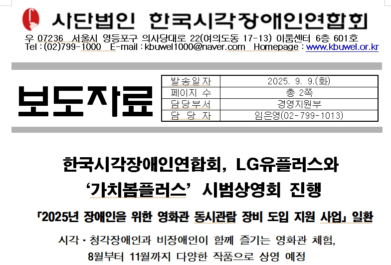 한국시각장애인연합회는 시각장애인의 권익 신장과 사회 참여 확대를 위해 다양한 활동을 펼쳐왔으며, 문화·예술 분야 접근성 확대를 중요한 과제로 삼고 있다. 「가치봄플러스」는 그 연장선에서 추진되는 사업으로, LG유플러스와의 협력을 바탕으로 누구나 안전하고 동등하게 영화를 즐길 수 있는 동시관람 환경을 일상으로 확장해 나갈 계획이다.