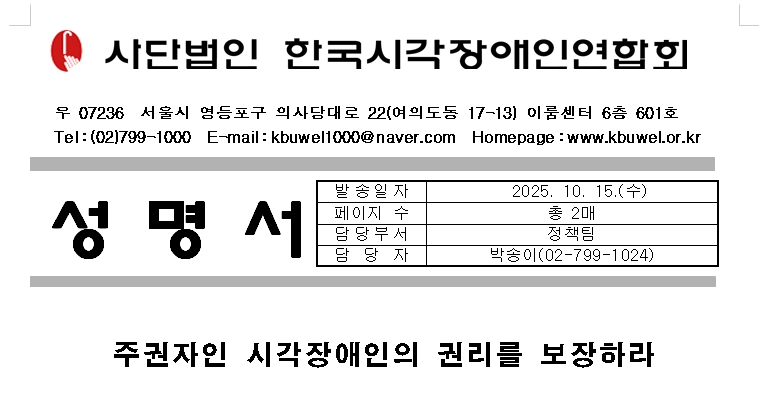 이에, 우리 한국시각장애인연합회는 다음 열 가지 현안 과제를 해결해 줄 것을 국회와 정부에 강력히 요구하며, 이 현안 과제가 해결될 때까지 협상과 투쟁을 병행하는 노력을 중단하지 않을 것을 분명히 밝힌다.
