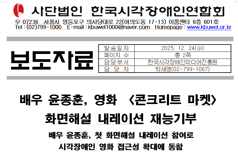 사단법인 한국시각장애인연합회는 앞으로도 작품의 성격과 메시지에 공감하는 배우들과의 협업을 통해, 화면해설 제작이 보다 자연스러운 영화 관람 환경으로 자리 잡을 수 있도록 노력해 나갈 계획이다.