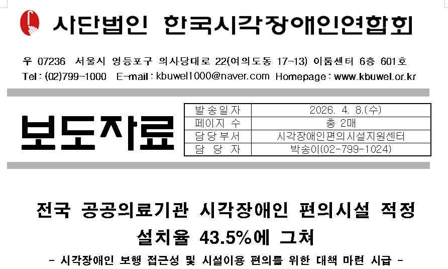 한국시각장애인연합회 중앙회 김재룡 회장은 “이번 조사 결과를 바탕으로 공공의료기관의 보행 접근성과 이용 편의성을 실질적으로 개선하기 위한 정책적·제도적 보완이 시급하다.”라고 강조했다. 아울러 “관련 법령의 기준 준수 여부를 점검하고, 현장 중심의 개선 조치를 강화하는 등 보다 적극적인 대응이 필요하다.”라고 지적했다.