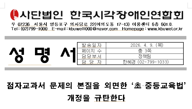 지난 3월 31일, 시각장애 학생 및 교원의 교과용 도서 지원과 관련된 초·중등교육법 제29조 개정안(의안번호 2217886)이 국회 본회의를 통과하였다. 그러나 한국시각장애인연합회는 이번 개정이 시각장애인의 교과서 접근권이 지닌 근본적인 구조적 문제를 해결하지 못한 채 형식적인 조치에 머물렀다는 점에서 이를 규탄한다.