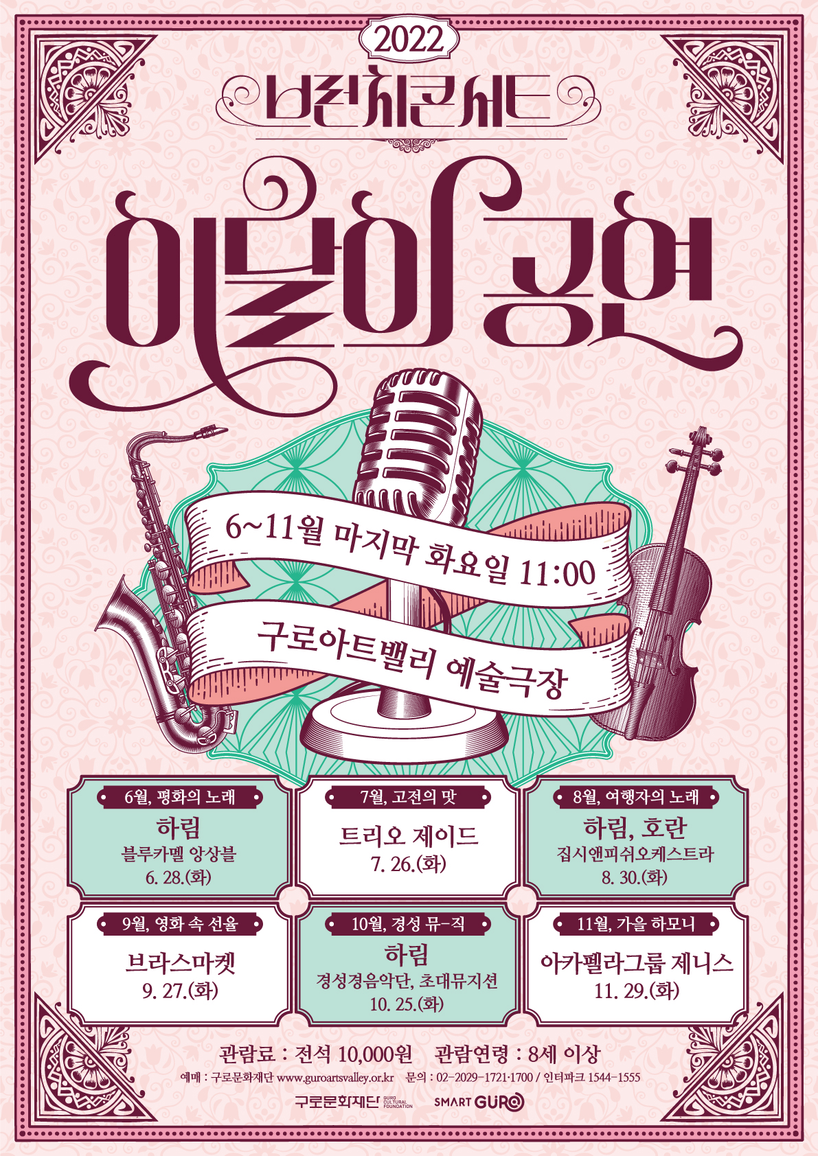 한국시각장애인연합회(이하 '한시련')와 구로문화재단은 6월부터 11월까지 매월 마지막 화요일 11시에 브런치콘서트 ‘이달의 공연’ 을 진행합니다.