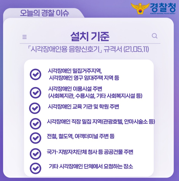 현재 시각장애인용 음향신호기 설치기준은 「시각장애인용 음향신호기」 규격서(21.05.11)에 의거하여 시각장애인 단체에서 요청하는장소에 설치하는것으로 규정되어 있습니다.