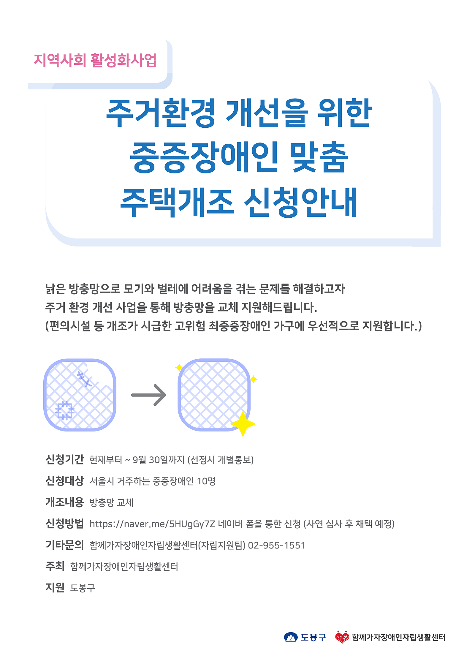 낡은 방충망으로 모기와 벌레에 어려움을 겪는 문제를 해결하고자 주거 환경 개선 사업을 통해 방충망을 교체 지원해드립니다.