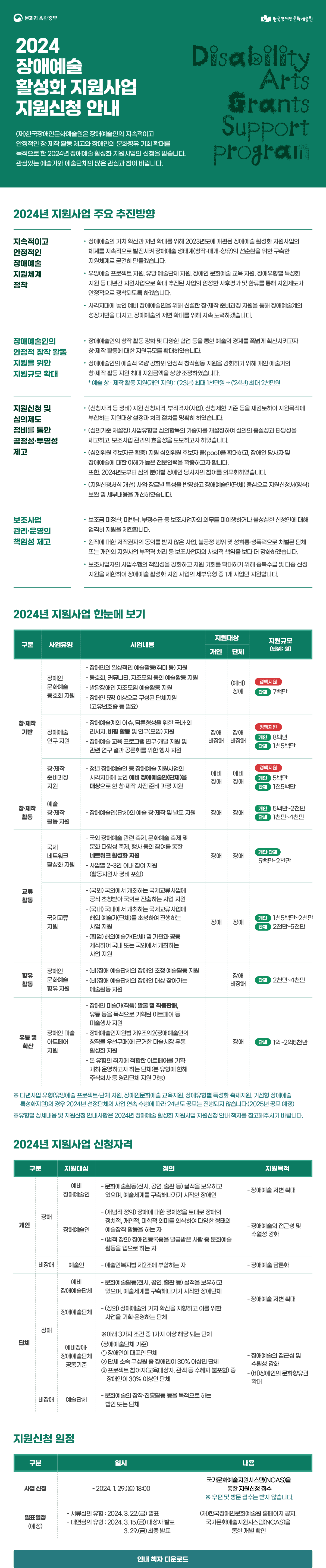 자세한 내용은 (재)한국장애인문화예술원 홈페이지 공모사업 게시판을 참고하시기 바랍니다.