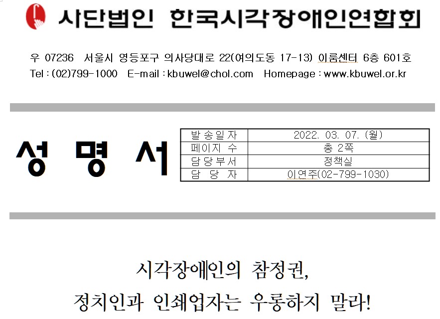 우리 연합회는 법적 근거가 없다는 논리 대신 시각장애선거인의 참정권을 보장할 수 있도록 중앙선거관리위원회가 ‘점자형 선거공보’의 품질 전수조사를 실시하고, 그 결과에 따라 선거비용보전을 제한할 것을 다시 한 번 강력히 요구한다. 아울러 후보자들도 공인된 ‘점자출판시설’에서 ‘점자형 선거공보’를 제작할 것을 촉구한다.