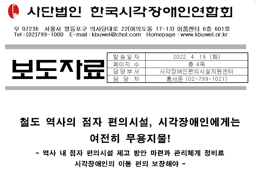 사단법인 한국시각장애인연합회(회장 김영일, 이하 한시련)는 지난 2019년 국립국어원에서 주관하고 한시련이 수행한 '2019년 점자 표기 실태 조사'와 관련하여, 계속되는 시각장애인의 불편 민원을 해소하고 조사 대상기관인 한국철도공사의 개선 의지를 확인하기 위해 재조사를 하였으나, 결과는 크게 나아지지 않은 것으로 나타났다.