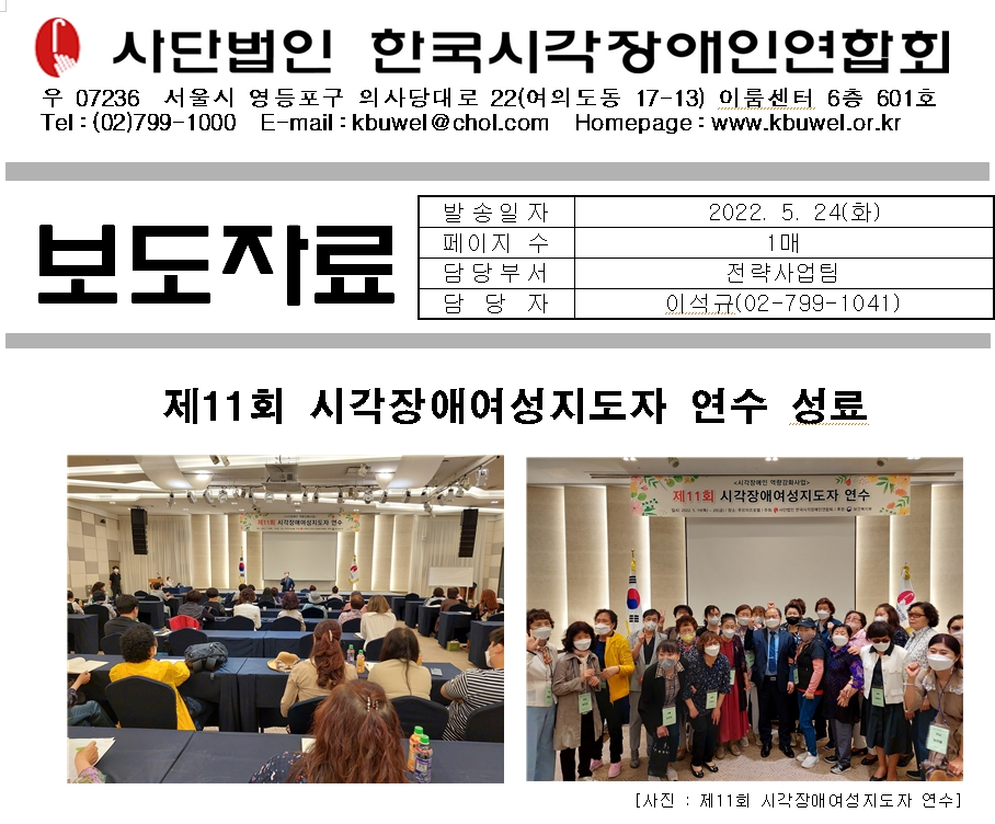 사단법인 한국시각장애인연합회(회장 김영일, 이하 ‘한시련’)는 ‘제11회 시각장애여성지도자 연수’를 5월 19일부터 1박 2일간 경기도 화성에 위치한 푸르미르호텔에서 실시하였다.