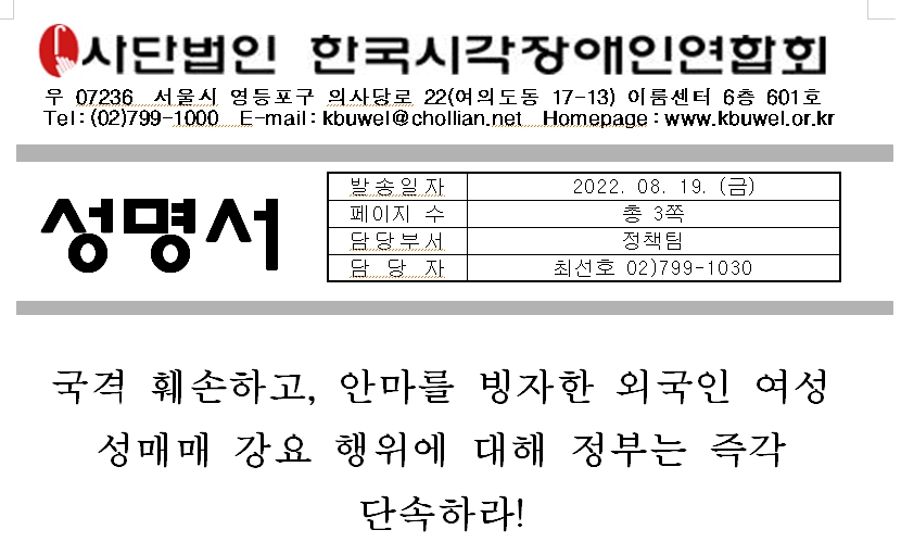 8월 16일 우리나라의 공영 방송인 KBS 시사기획 창 ‘2022 인신매매보고서’방송분에 ‘한국 취업은 끔찍하였다'라는 어느 태국 여성의 눈물의 보도는 국내와 태국 현지 실태를 취재 방영한 내용으로, 안마사의 한 사람으로 비애를 느끼고, 현재 우리나라의 정의롭지도 공정하지도 못한 민낯이 드러남에 격분할 수밖에 없다. 태국의 SNS에는 한국의 마사지업체 광고가 넘쳐나고 있으며, 업체를 통하여 한국에 전문 안마사로 취업시켜 주겠다며 국내에 들어오면 성매매를 강요하고, 불응 시 폭행과 함께 도주를 막기 위한 야비한 방법으로 여권 및 신분증을 강탈하여, 자신들의 이익을 위해 성매매 현장으로 내몰고 있다.