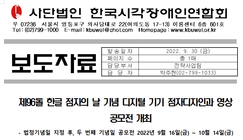 (사)한국시각장애인연합회(회장 김영일)는 제96돌 한글 점자의 날을 기념하여 ‘디지털 기기 점자디자인과 영상 공모전’을 개최한다.