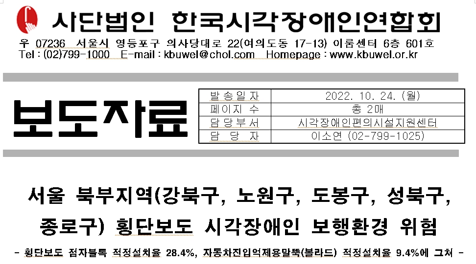 (사)한국시각장애인연합회 중앙회(회장 김영일, 이하 ‘한시련’) 시각장애인편의시설지원센터는 2022년 4월 7일부터 8월 31일까지 약 4개월간 시각장애인의 횡단보도 보행환경 개선을 위해 「교통약자의 이동편의증진법」을 근거로 서울시 북부도로사업소 관할 교차로 663개소 총 2,411개의 횡단보도 점자블록, 자동차진입억제용말뚝(이하 ‘볼라드’) 등을 현장 조사를 실시하였다.
