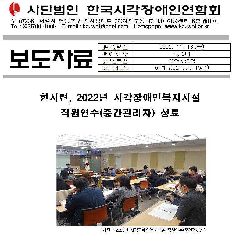 사단법인 한국시각장애인연합회(회장 김영일, 이하 ‘한시련’)는 11월 15일부터 16일까지 1박 2일간 “2022년 시각장애인복지시설 직원연수(중간관리자)”를 마무리했다.