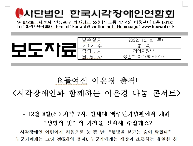시각장애인과 함께하는 이은경 나눔콘서트가 12월 8일 (목) 저녁 7시에 연세대학교 백주년기념관에서 시각장애인 200여명을 비롯하여, 생명의 빛이 되고자 하는 관객들과 함께 화려하게 펼쳐진다.