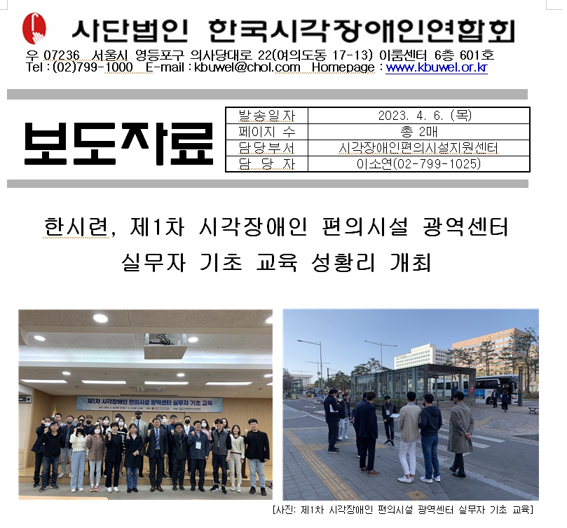 사단법인 한국시각장애인연합회(회장 김영일, 이하 “한시련”)는 3월 30~31일, 1박 2일 일정으로 서울 영등포구 소재 이룸센터에서 제1차 시각장애인 편의시설 광역센터 실무자 기초 교육을 성황리에 개최했다.