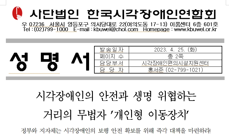 하나, 국토교통부와 행정안전부는 시각장애인의 안전과 생명을 위협하는 개인형 이동장치 관련 법령을 개정하라!