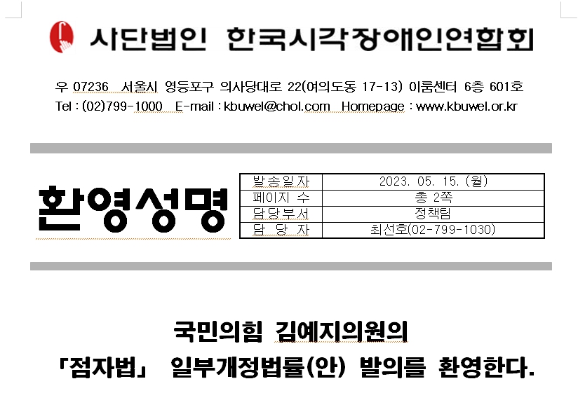50만 시각장애인을 대표하는 한국시각장애인연합회는 이번 김예지의원의 「점자법」일부개정법률안을 적극 환영한다.